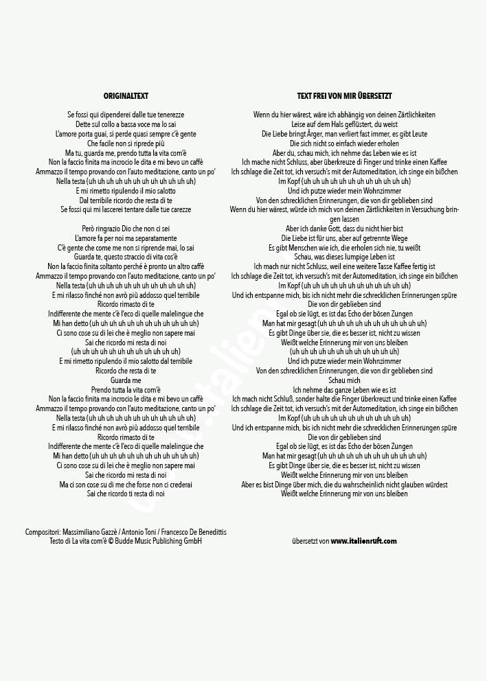 Zugegeben, das Lied was ich euch heute präsentiere, ist schon etwas älter, es kam September 2015 auf dem Markt. Aber ich mag den Rhythmus, den Text und vor allem das Video. Es zeigt eine etwas andere Welt, weder chic noch raffiniert, ganz im Gegenteil. Hier den Link zum Lied „La Vita Com’è“ – Max Gazzè: https://www.youtube.com/La Vita Com’è