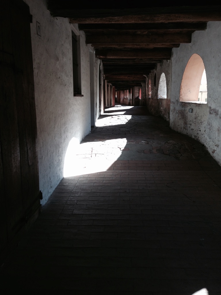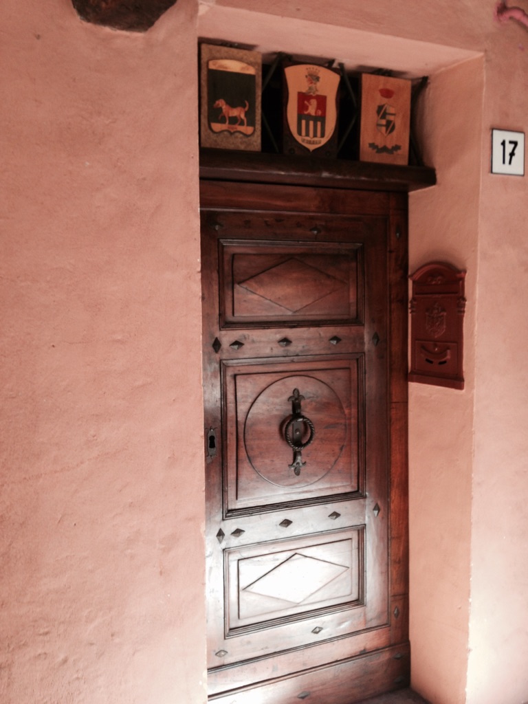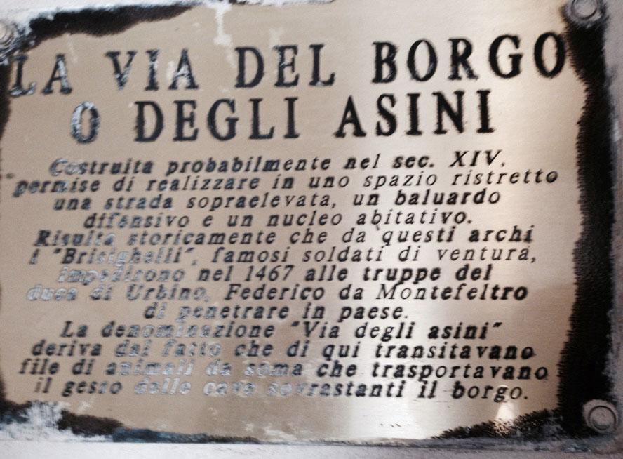 Wie dieses Schild besagt, entstand die Straße wahrscheinlich im 14. Jahrhundert. Die Straße führt über die untern Gebäuden und verschafft Zugang zu den Wohneinheiten. Sie diente als Schutzwall der Ortschaft. Laut historischen Quellen, haben die “Brisighelli”, berühmt als Söldner, 1467 von diesen Bögen aus die Truppen des Herzogs von Urbino, Federico da Montefeltro, daran gehindert in das Dorf einzudringen.