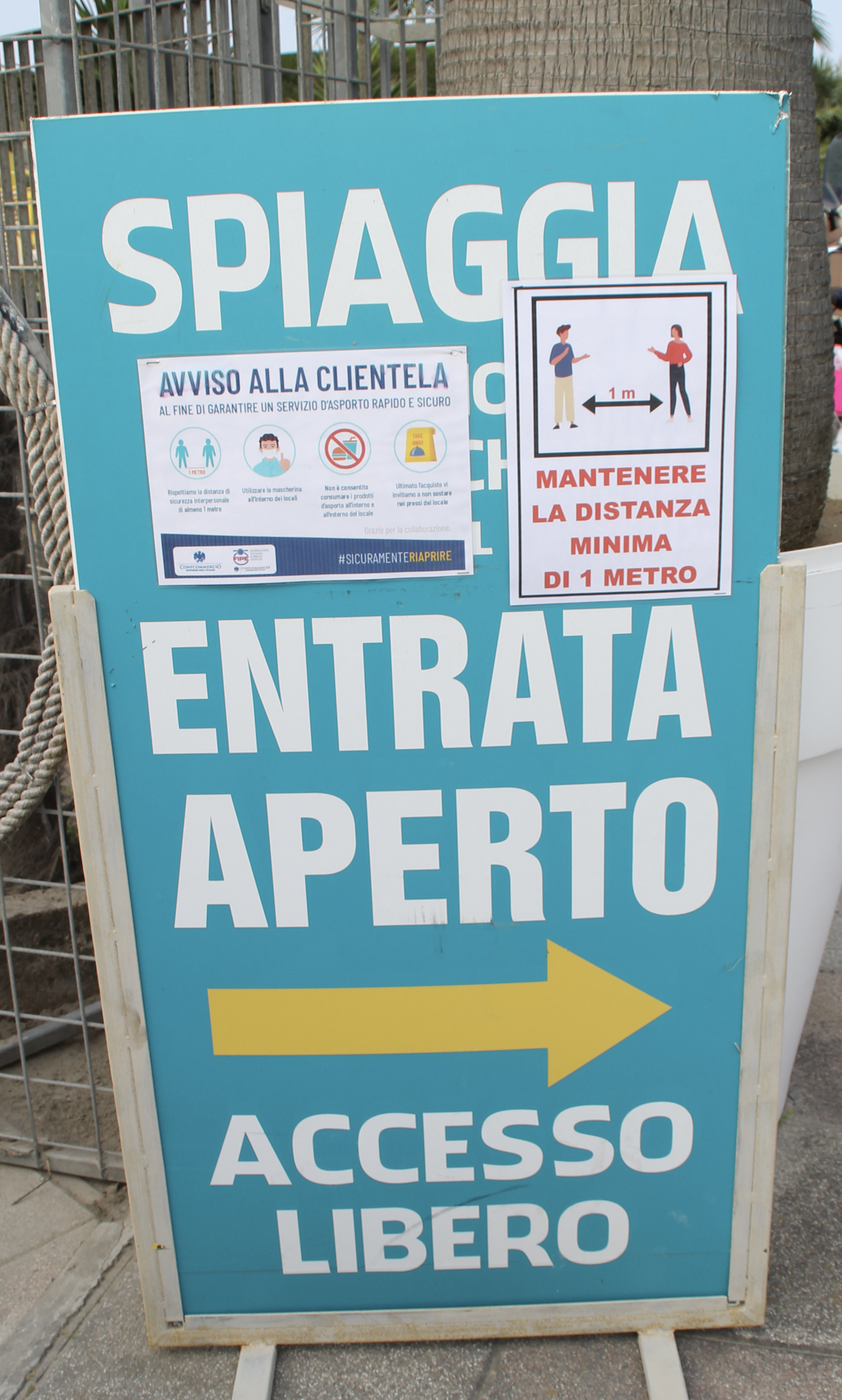 Die Regeln, die am Strand zu befolgen sind, lassen sich von der Beschilderung gut ablesen: Der 1 Meter-Abstand ist zu befolgen. In den Lokalen muss man die Schutzmasken tragen. Speisen zum mitnehmen, also das klassische Take-away, dürfen nicht in den Lokalen verzehrt werden und man darf auch nicht mit diesem vor dem Lokal verweilen. Also, gleich zurück an seinen Badeplatz.