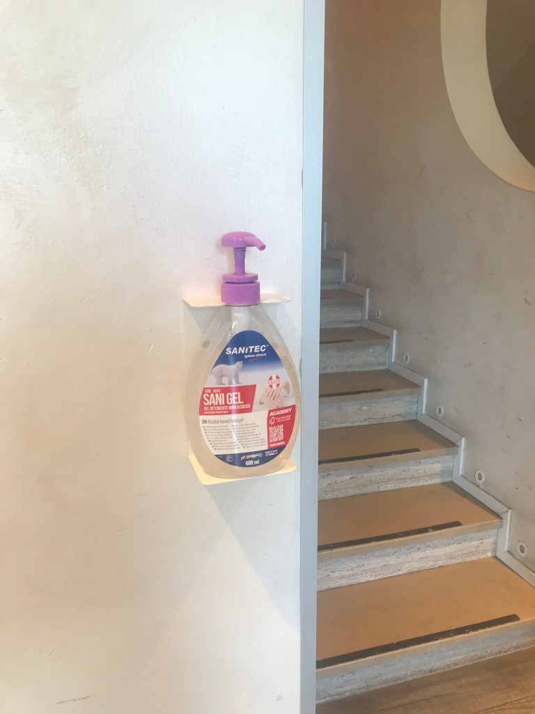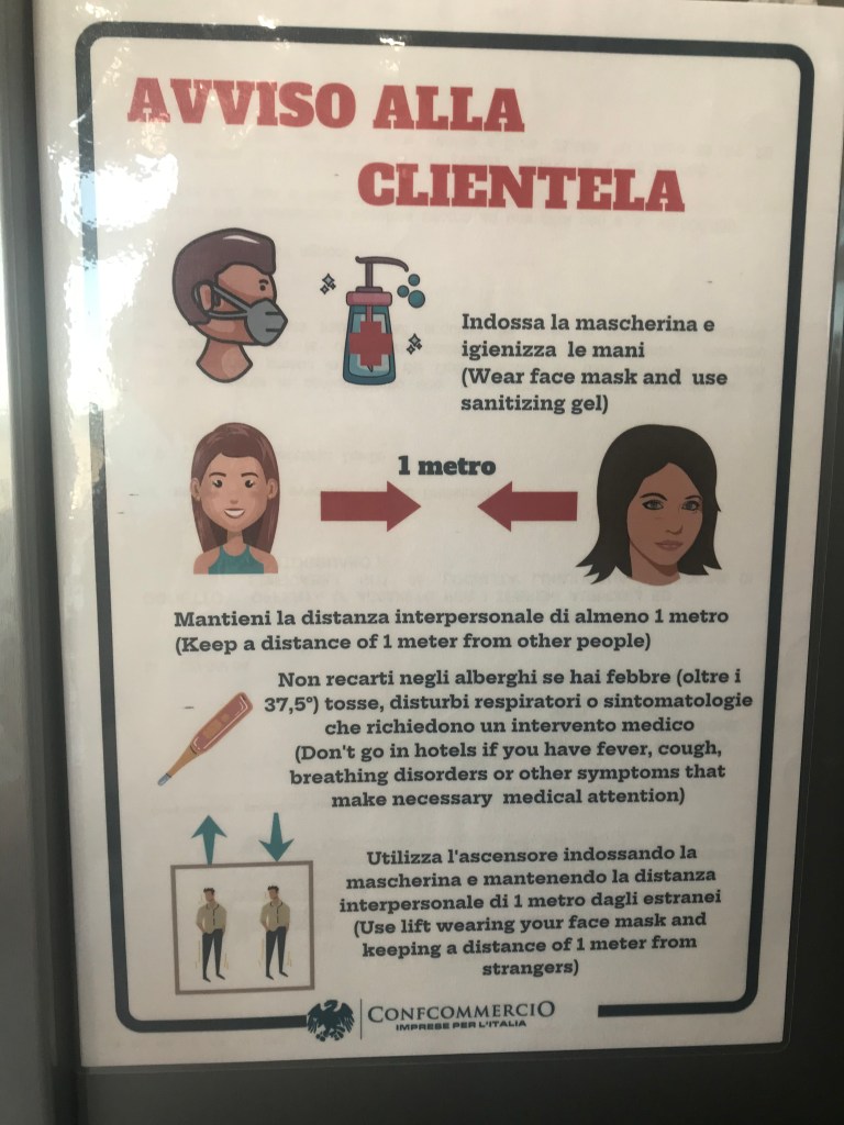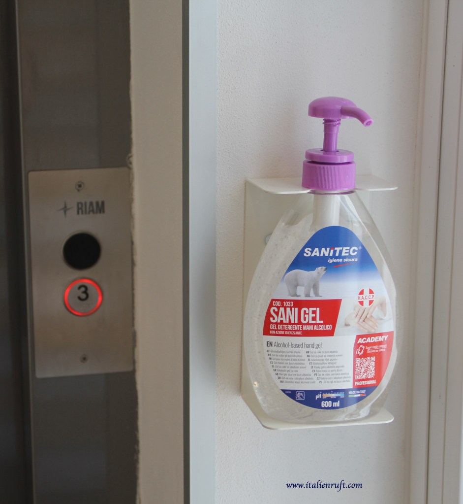 Am Hotel angeCaorle Freitag Abend: Am Hotel angekommen, begrüßt uns (mein Mann und ich) am Eingang ein Schild und ein Spender mit Desinfektionsmittel. Der neue Willkommensgruß im Hotel: Bitte mal schnell die Hände desinfizieren und die Mundschutzmasken aufsetzten.