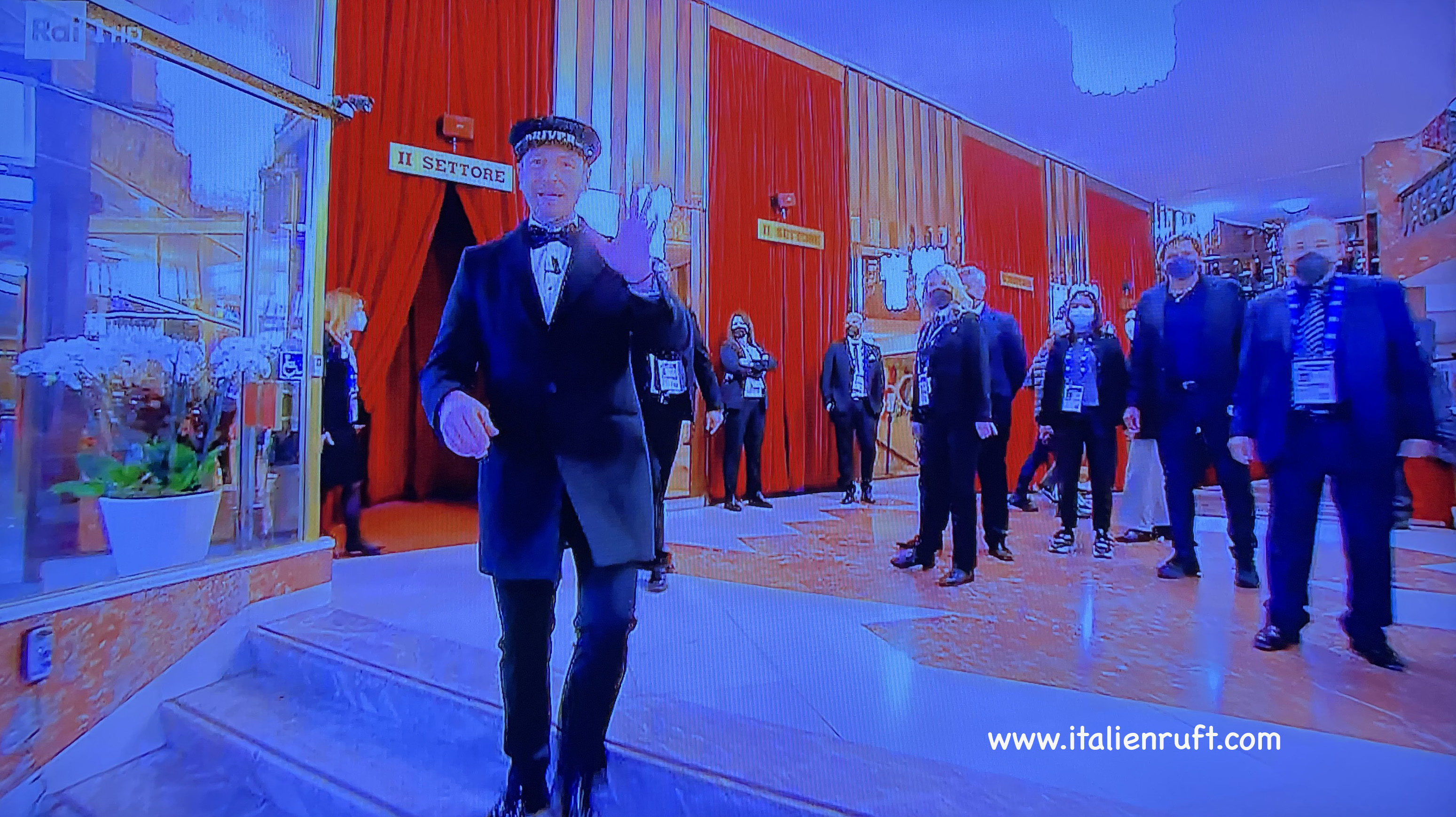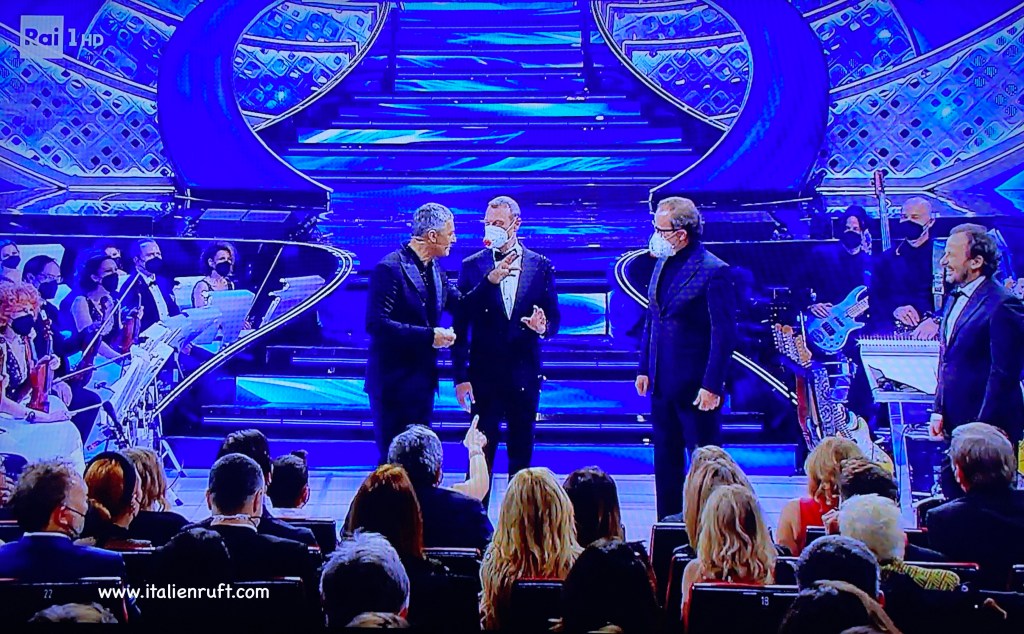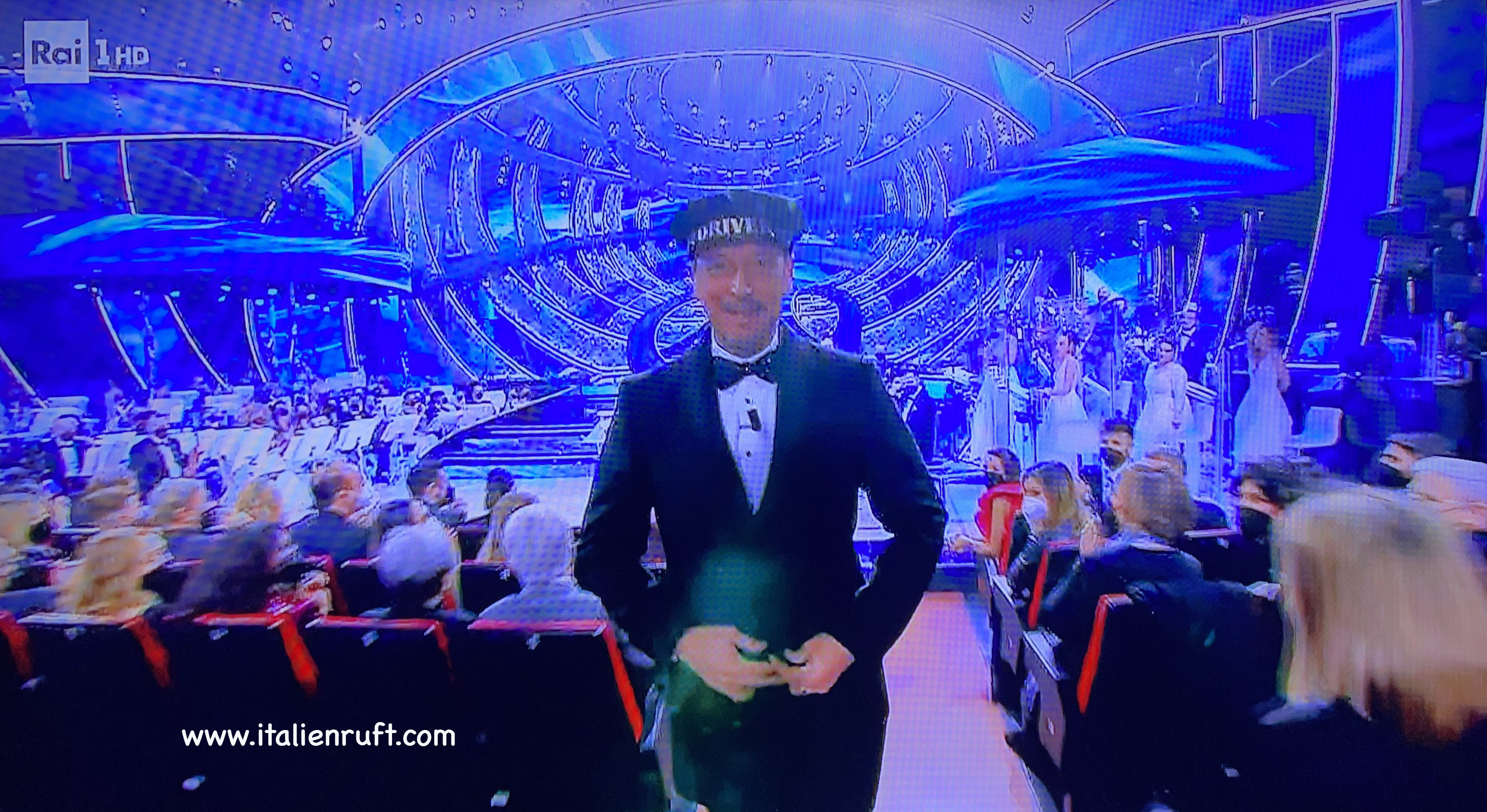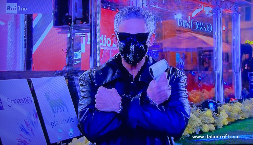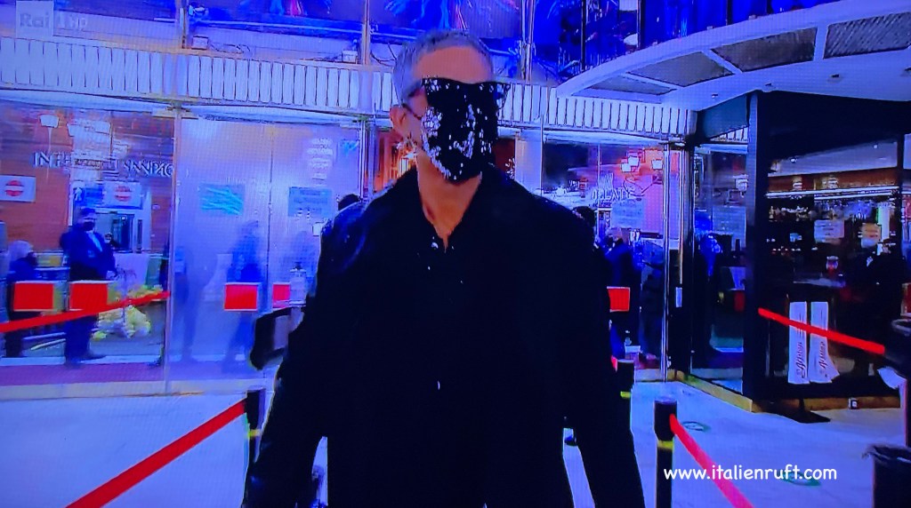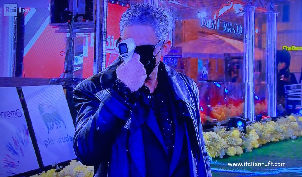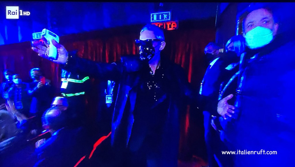Fiorello! Sein Auftritt war wie zu erwarten ohne gleichen, angekündigt von Amadeus, aber die An-Moderation hat Fiorello geschrieben, das war sofort klar. Und da stand er am Eingang: gekleidet wie Keanu Reeves in Matrix, ebenso die Haltung, gewappnet nicht mit einer Pistole, sondern mit einem Stirnthermometer! Und dieses wurde gleich nicht nur auf sich selbst und auf das Publikum gezielt, sonder auch auf dem Direktor von RAI1 Stefano Coletta. Troppo forte!!! Er kann sich alles erlauben.