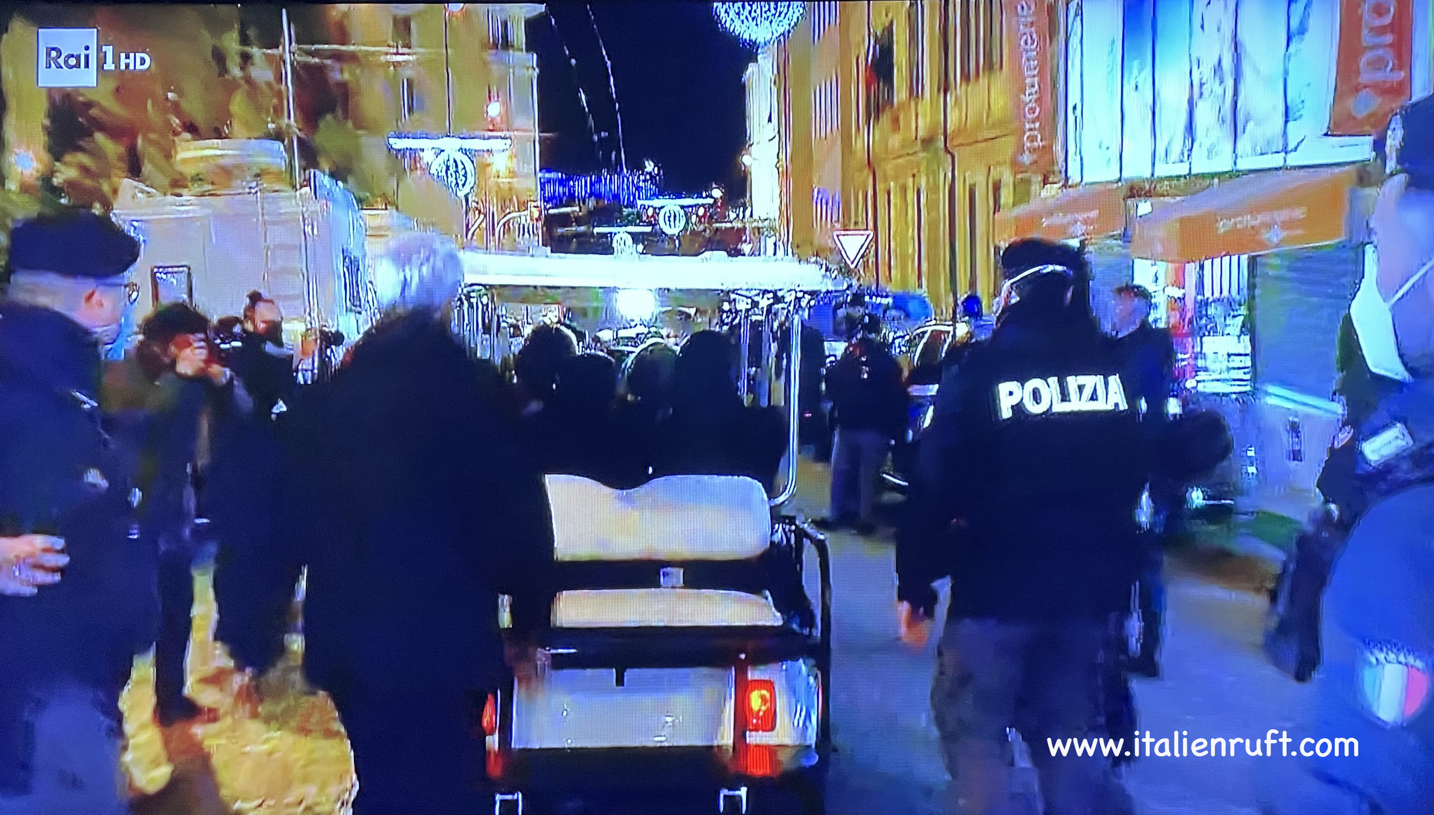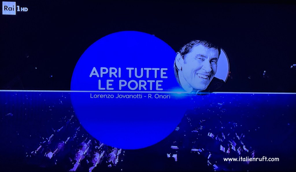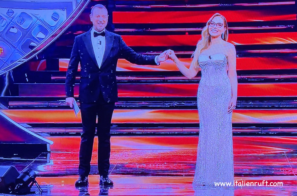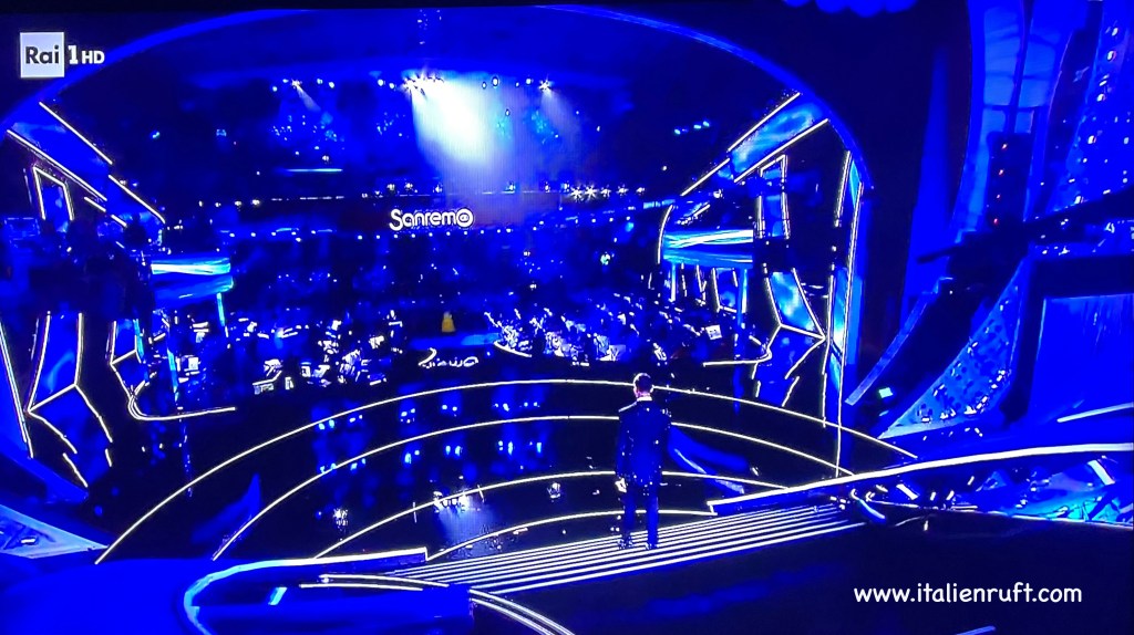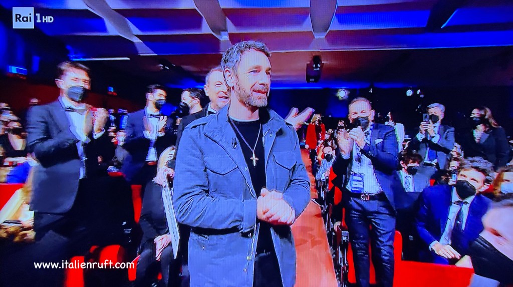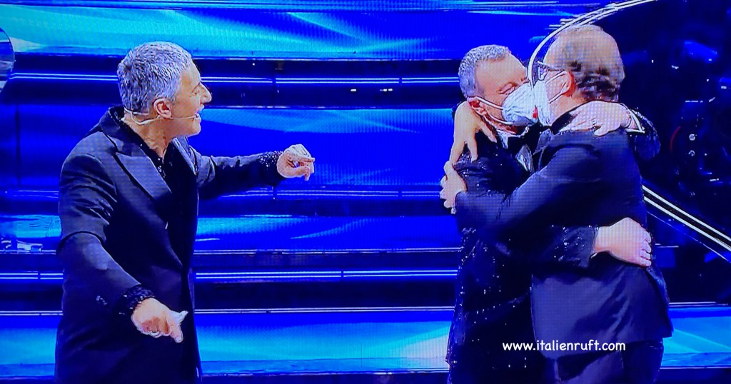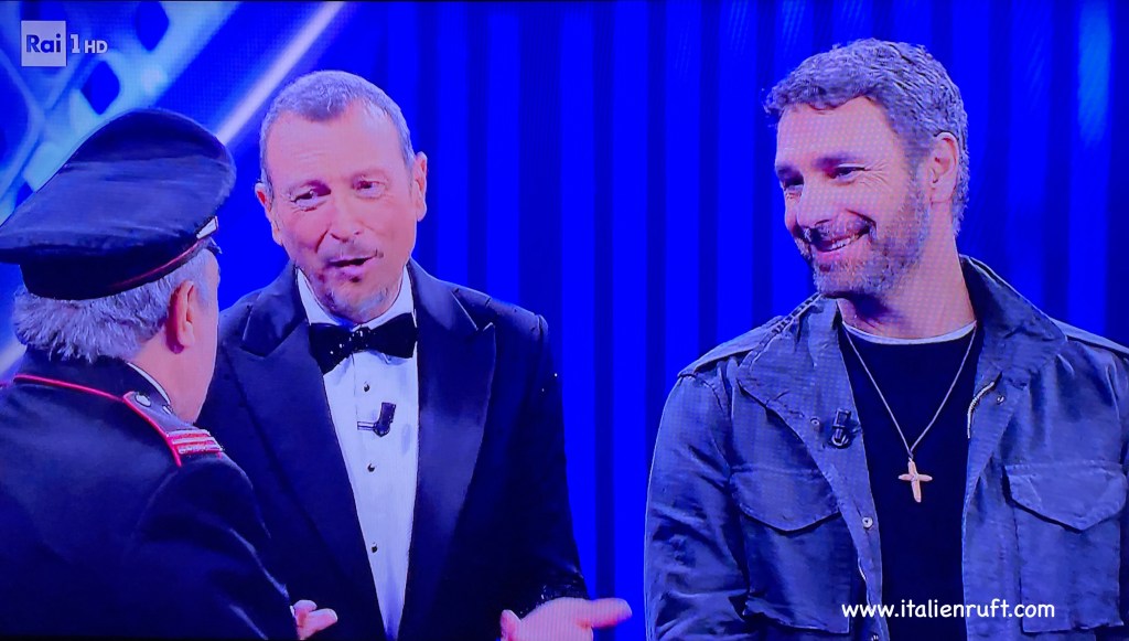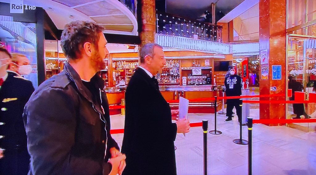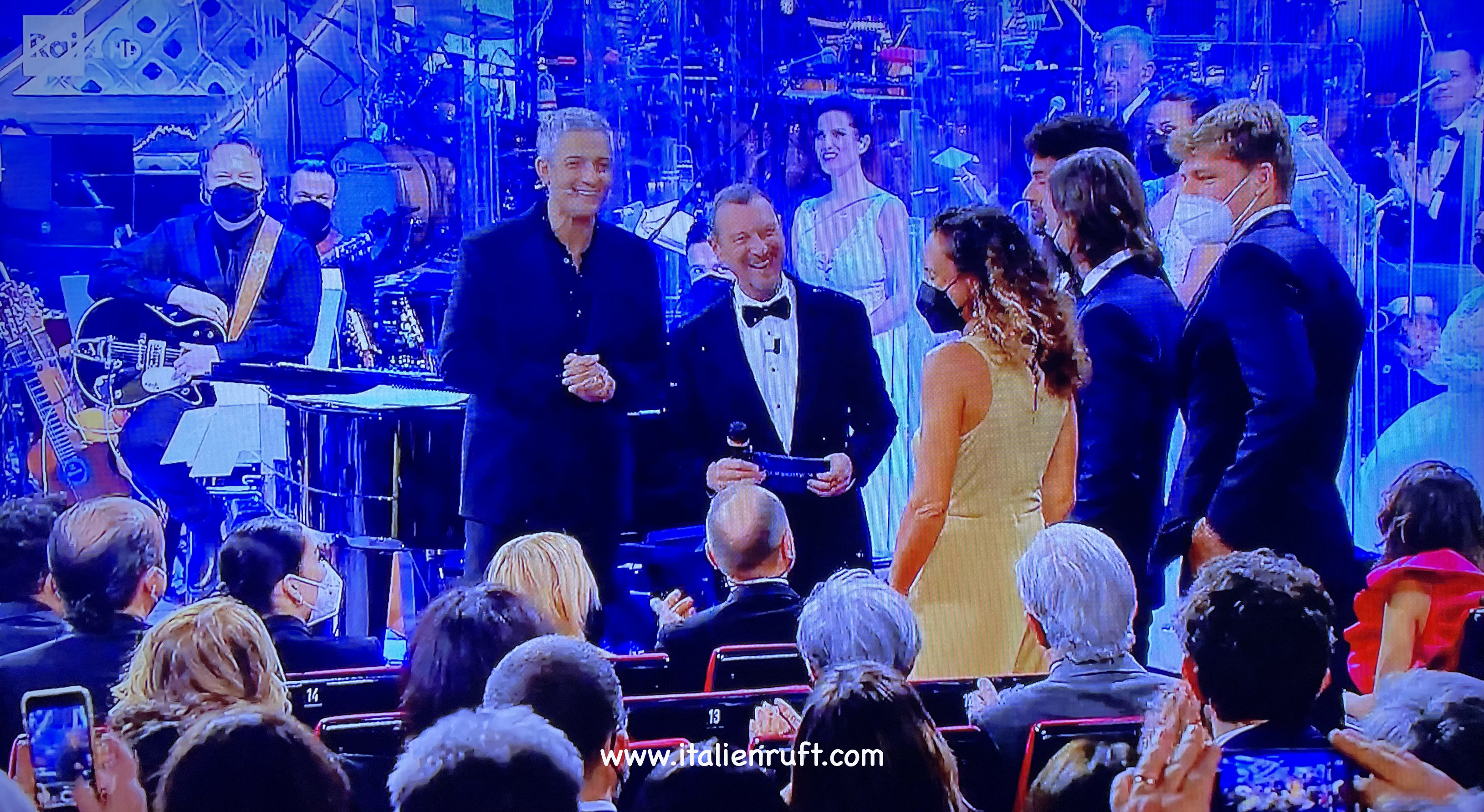 Fiorello! Sein Auftritt war wie zu erwarten ohne gleichen, angekündigt von Amadeus, aber die An-Moderation hat Fiorello geschrieben, das war sofort klar. Und da stand er am Eingang: gekleidet wie Keanu Reeves in Matrix, ebenso die Haltung, gewappnet nicht mit einer Pistole, sondern mit einem Stirnthermometer! Und dieses wurde gleich nicht nur auf sich selbst und auf das Publikum gezielt, sonder auch auf dem Direktor von RAI1 Stefano Coletta. Troppo forte!!! Er kann sich alles erlauben.