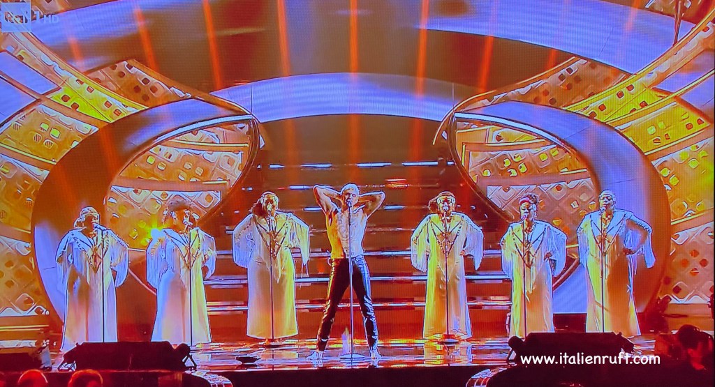 Viel Zeit für die Präsentation und der Förmlichkeiten hat der Moderator Amadeus am ersten Abend nicht verschwendet. Sofort startete Achille Lauro mit dem Harlem Gospel Choir als erster Konkurrent. Die Melodie ist mehr so etwas wie Easy Listening mit Gospel Chor. Aber am Ende seines Auftrittes kam vielleicht die etwas wenig angebrachte Geste. Er kniete sich nieder, nahm eine Schale mit Wasser und kippte diese über seinen Kopf, als würde er sich taufen.