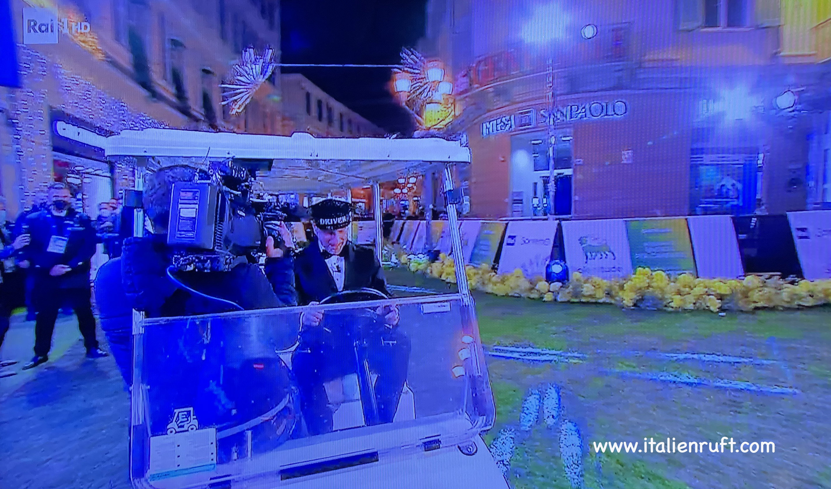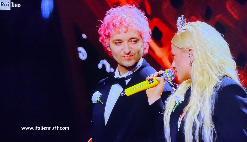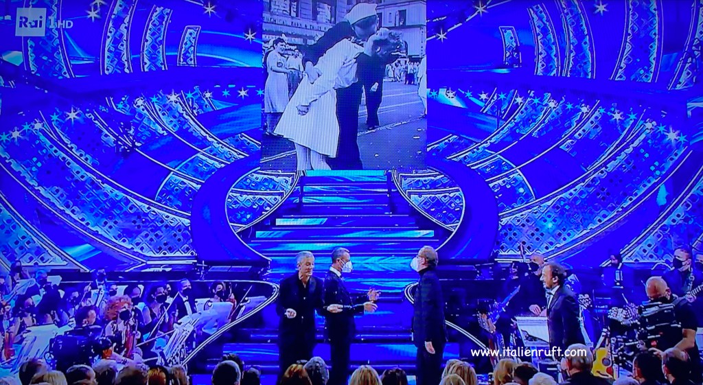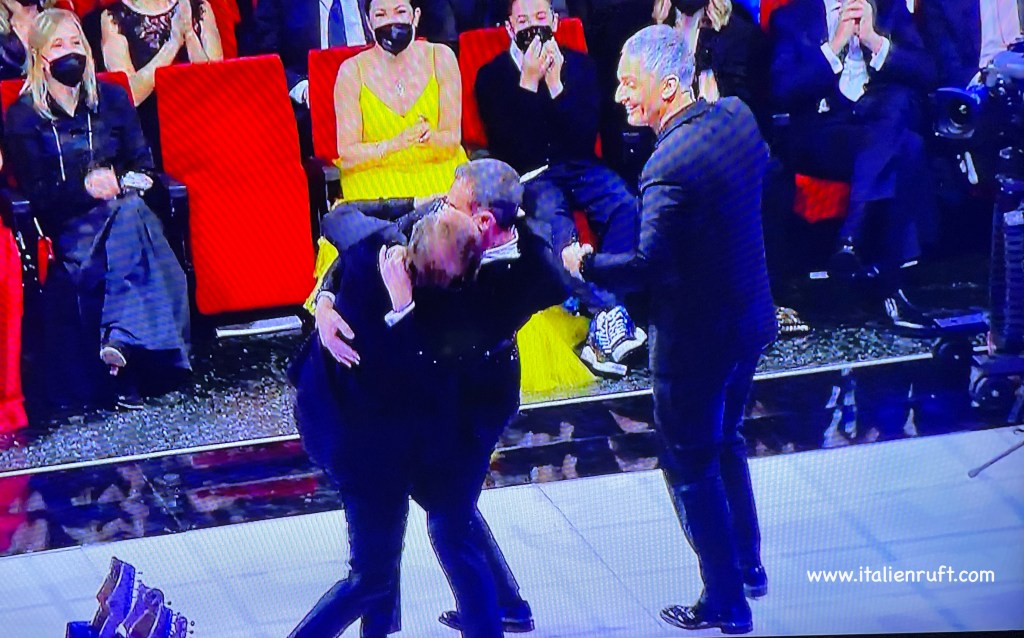 Geplant war es nicht, dass sie beide zum dritten Mal das Festival von Sanremo moderieren. Letzte Jahr während des Festivals sagten sie, da der Publikumssaal wegen den Covid-Vorschriften leer war, dass sie für das Jahr 2022 für ihre Nachfolger ein volles Theater wünschen, aber dass das Festival nicht erfolgreicher sein soll als das von 2021. Und jetzt haben sie den Salat. Tja, wie macht man dieses schlechte Omen jetzt rückgängig? Fiorello hatte natürlich die Lösung: Amadeus muss den Direktor von RAI1 küssen. Aber nicht irgendeinen Kuss, nein! Sie müssen den vom Times Square in New York nachspielen. Ja, es wäre nicht Fiorello, wenn er nicht Amadeus in Verlegenheit bringen würde. Da musste Amadeus durch: