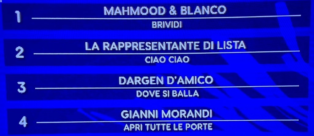 Als 5. im Rennen (in gara) war das Duo La rappresentante di lista, die ich nicht schlecht fand und dann Michele Bravi, eher langweilig.