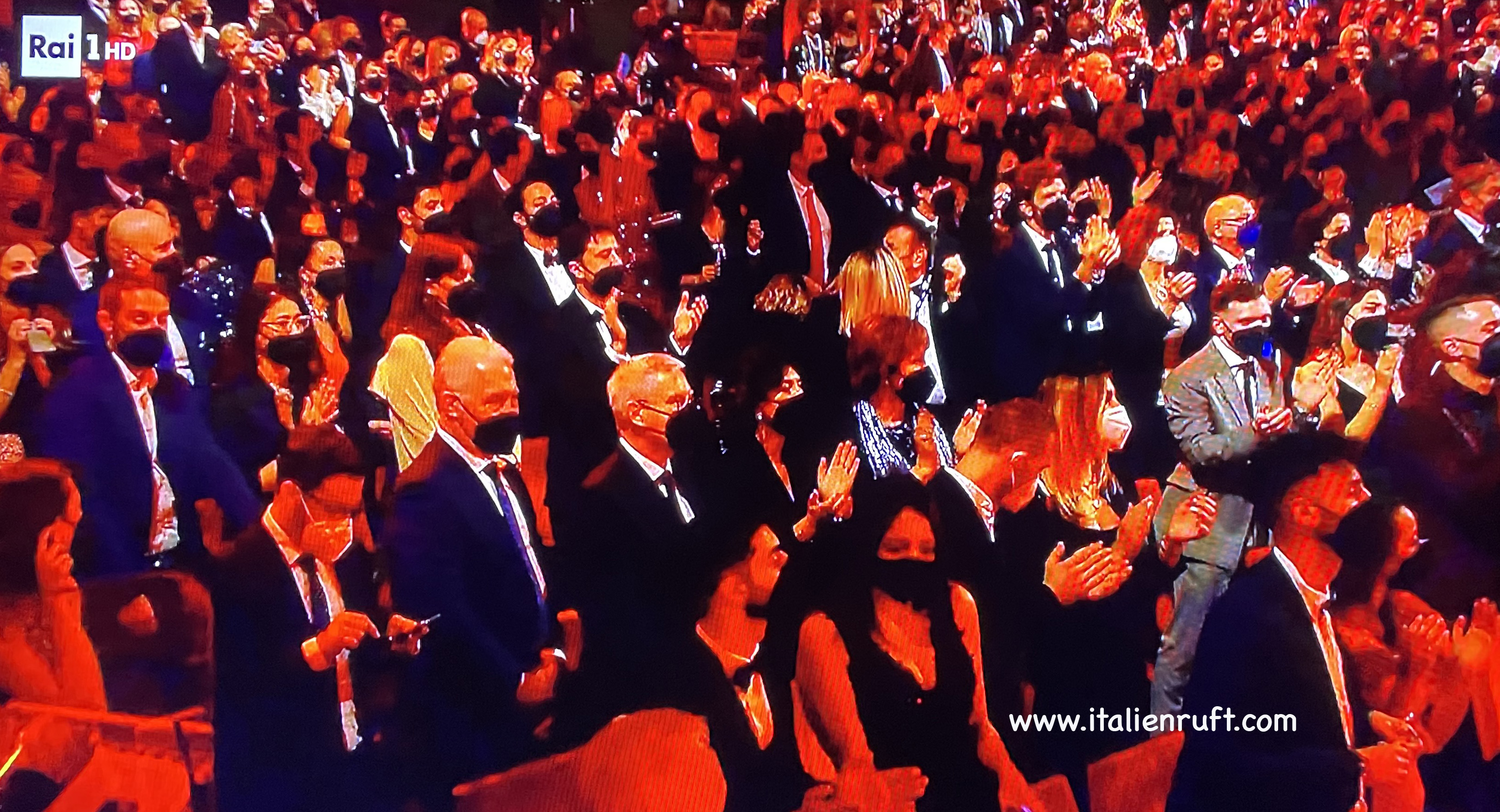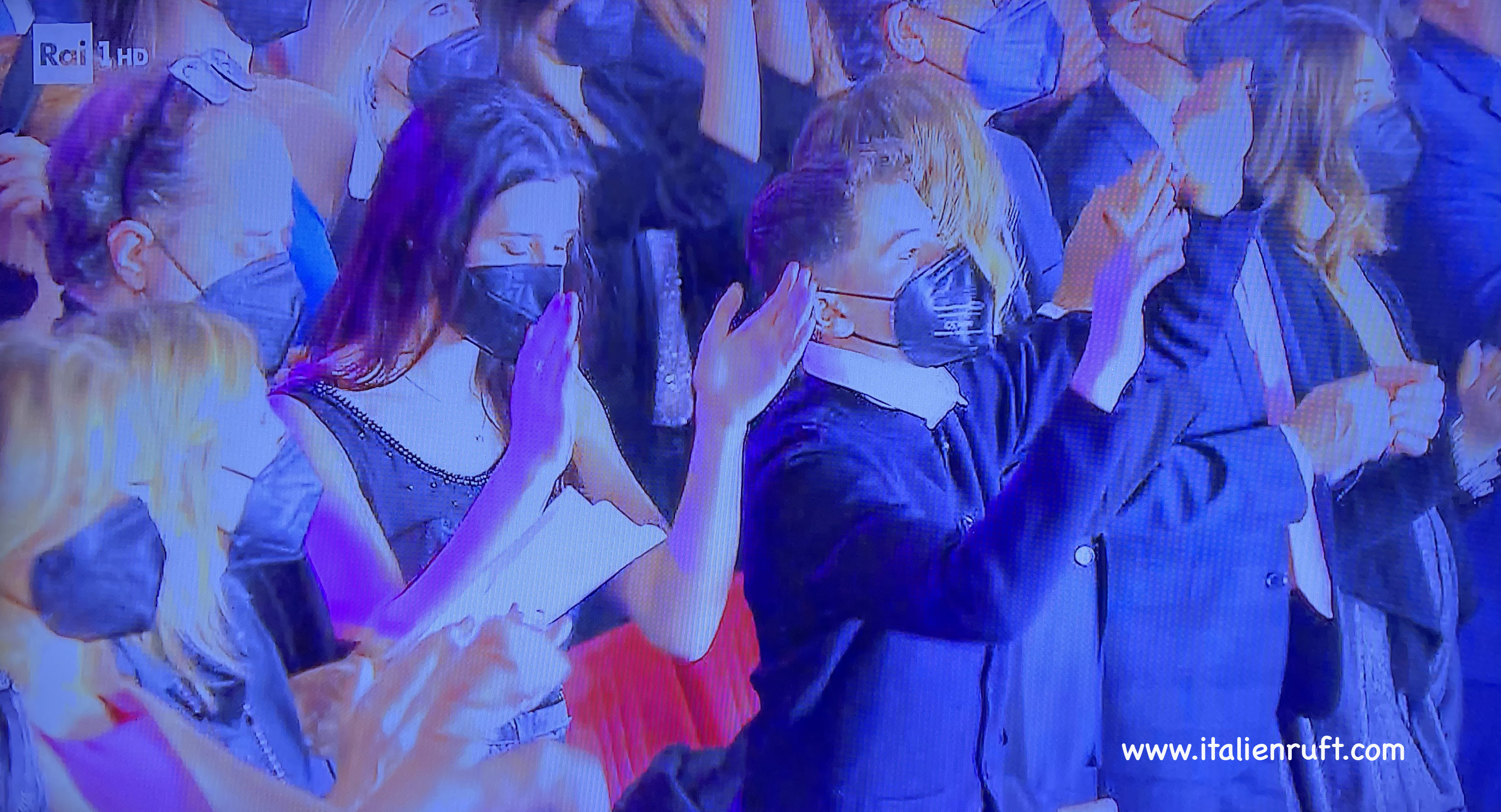Also ich war etwas überrascht und es ist etwas peinlich, ich wusste nicht, dass die Band Meduza eine italienische Band ist 😬. Amadeus forderte das Publikum auf, sowohl im Saal als auch zu Hause aufzustehen und zu tanzen. Und so tanzten im Theater alle samt Orchester nach dem elektronischen Rhythmus der Meduzas mit Mundschutzmaske. Hilfe mir hätte der Atem gefehlt.